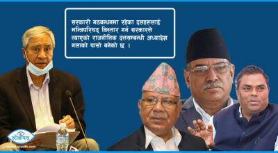 काठमाडौं । सरकारी गठबन्धनमा रहेका दलहरूलाई मन्त्रिपरिषद् विस्तार गर्न सरकारले ल्याएको राजनीतिक दलसम्बन्धी अध्यादेश गलाको