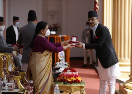 काठमाडौं । के.एल. दुगड ग्रुपका प्रबन्ध निर्देशक युवा उद्योगी विकास दुगडलाई राष्ट्रपती विद्यादेवी भण्डारी बाट
