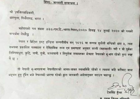 भारतले गुन्जी, कालापानी र लिम्पियाधुरामा नेपाली नागरिकको प्रवेश रोक्ने आशयमा पठाएको पत्रको जवाफ दिँदै नेपाली