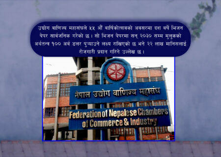 काठमाडौं । बृहत लक्ष्यसहित नेपाल उद्योग वाणिज्य महासंघले १० वर्षे भिजनपेपर सार्वजनिक गरेको छ ।