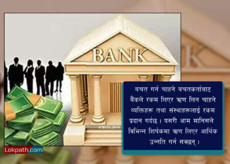 काठमाडौं । वित्तीय कारोबार गर्ने इजाजतपत्रप्राप्त संस्था बैंक, जसले रकमको बचत,बचतको भुक्तानी, ऋण प्रवाह र