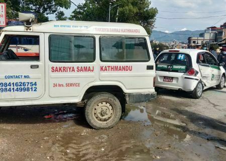 काठमाडौं । काठमाडौंको गौशालामा एम्बुलेन्स र कार एक आपसमा ठोक्किएका छन् । गौशलाको मित्रपार्कबाट एयरपोर्ट