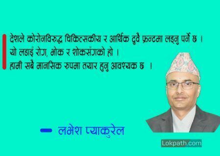 लभेश प्याकुरेल काठमाडौं । नेपाल सरकार र नेपाली जनता आज कोरोनभाइरस (कोभिड–१९) विरुद्धको ‘युद्ध’मा होमिएका