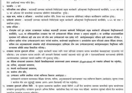 काठमाडौं । काठमाडौं उपत्यका खानेपानी लिमिटेडले प्रमुख कार्यकारी अधिकृत पदका लागि दरखास्त आह्वान गरेको छ