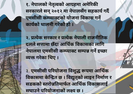 काठमाडौँ। मिलेनियम च्यालेन्ज कर्पोरेसन कम्प्याक्ट(एमसीसी) एमसीसीमा कुनै पनि सैन्य मामिला जोडिएको नजोडिएको अमेरिकी दूतावासले स्पष्ट