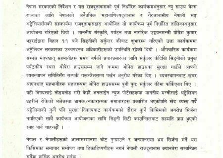 काठमाडौँ । अस्ट्रेलियास्थित नेपाली दूतावासले पर्यटनमन्त्री योगेश भट्टराईबारे प्रकाशित समाचारबारे आफ्नो धारणा सार्वजनिक गरेको छ