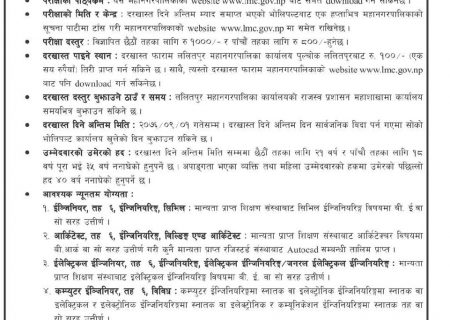 ललितपुर महानगरपालिकाले विभिन्न ८ पदमा ३३ कर्मचारी माग गरेको छ । महानगरपालिकाले करारमा नियुक्त गर्ने