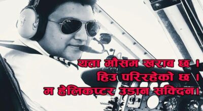 काठमाडौं । दुर्घटनाग्रस्त हेलिकप्टरका क्याप्टेन प्रभाकर केसीले हिउँ परिरहेका कारण हेलिकप्टर उडाउन नसक्ने बताएका थिए