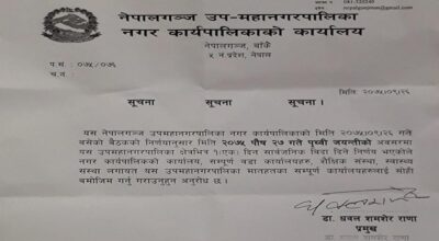 नेपालगन्ज–नेपालगञ्ज उपमहानगरपालिकाले शुक्रबार पृथ्वी जयन्तीका अवसरमा सार्वजनिक बिदा दिने निर्णय गरेको छ । आज बसेको