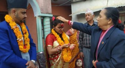 बाँके–पूर्वउपसभामुख पूर्णाकुमारी सुवेदी दम्पतिले एकल भएकी जेठी बुहारीलाई छोरीका रुपमा विवाह गरेर पठाएका छन् ।
