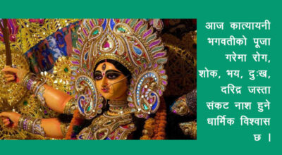 काठमाडौं । आज बडा दशैँको छैठौं दिन घर–घरमा कात्यायनी माताको पूजा गरि मनाइँदै छ ।