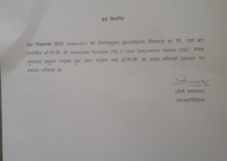 काठमाडौँ– नेपाल गुणस्तर तथा नापतौल विभागले इन्टरनेशनल सिमेन्ट प्रालिको इजाजतपत्र रद्द गरेको हो । विभागको