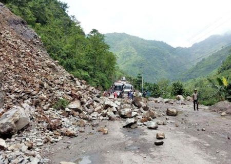 पर्वत । अविरल वर्षासँगै सडक माथिबाट खसेको पहिरोका कारण अवरुद्ध भएको पोखरा–बागलुङ सडक खण्ड १२