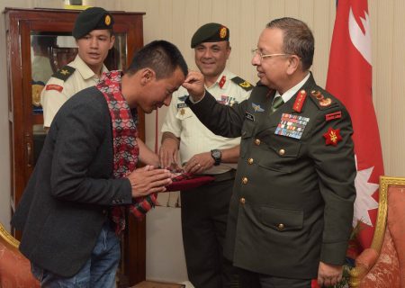 काठमाडौं । नेपाली सेनाले सर्वोच्च शिखर सगरमाथा कीर्तिमान आरोही पेम्बा दोर्जे शर्पालाई आइतवार सम्मान गरेको