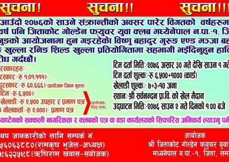 काठमाडौं । लमजुङको श्री सर्वानान्दन प्रा.विको खेल मैदानमा खुल्ला फुटबल प्रतियोगिता हुने भएको छ ।