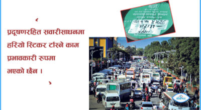 प्रदूषणरहित सवारीसाधनमा हरियो स्टिकर टाँस्ने काम प्रभावकारी रूपमा हुन सकिरहेको छैन । यातायात व्यवस्था विभागको