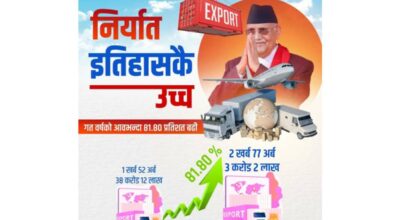 काठमाडौं । प्रधानमन्त्री केपी शर्मा ओलीले चालु आर्थिक वर्ष २०८१/८२ मा नेपालले इतिहासमै उच्च निर्यात