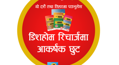 काठमाडौं । रिचार्ज कार्ड तथा विभिन्न डिजिटल माध्यममार्फत डिशहोम रिचार्ज गर्दा ग्राहकहरुले आकर्षक बोनस पाउने