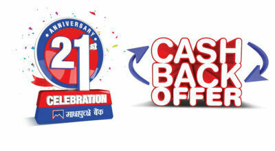 काठमाडौं । माछापुच्छ्रे बैंकले आफ्नो २१ औँ वार्षिकोत्सवको अवसरमा ग्राहकहरुलाई २१ प्रतिशत क्यास ब्याक र