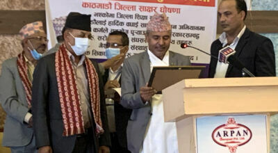 काठमाडौं । सङ्घीय मुलुकको राजधानी काठमाडौं जिल्ला साक्षर घोषित भएको छ । साक्षर घोषणा हुनेमध्ये