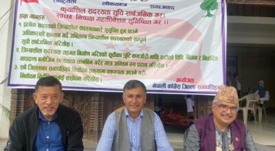काठमाडौं । विभिन्न मागहरुसहित मंगलबार पार्टी कार्यालयमा धर्ना दिएका नेपाली कांग्रेसका जिल्ला सभापतिहरुले आजबाट रिले