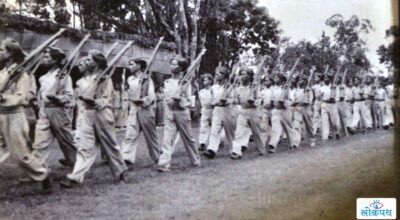 बि.स. २००७ सालमा प्रजातन्त्र स्थापना भएपछि मार्चपास गर्दै नेपाली कांग्रेसका मुक्तिसेनाहरु । तस्विर सौजन्यः वीपी