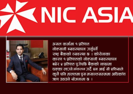 काठमाडौं । एनआईसी एशिया बैंकले कोरोना भाइरसको संक्रमणका कारण पूर्णरुपमा प्रभावित भएका ऋणीलाई निकै दबाव
