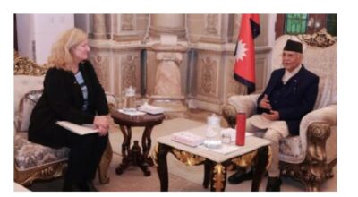 काठमाडौं । प्रधानमन्त्री केपी शर्मा ओलीसँग नेपालका लागि फ्रान्सका राजदूत भर्जिनिइ कोर्टेभालले आज शिष्टाचार भेट गरेकी