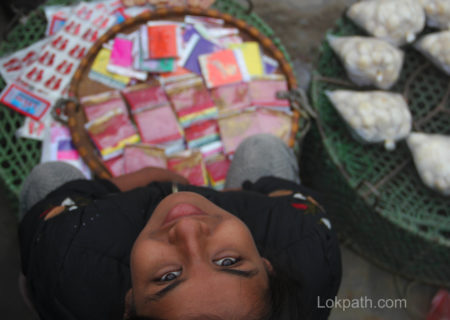 काठमाडौं । ‘२० रुपैयाँ मात्र हो दिदी लग्नुस् न !’ असन चोकमा सप्तरङ्गी टिका बेच्न
