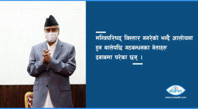 काठमाडौं । प्रधानमन्त्री शेरबहादुर देउवाले प्रधानमन्त्री पदको शपथग्रहण गरेको एक महिनासम्म पनि मन्त्रिपरिषद्लाई पूर्णता दिन